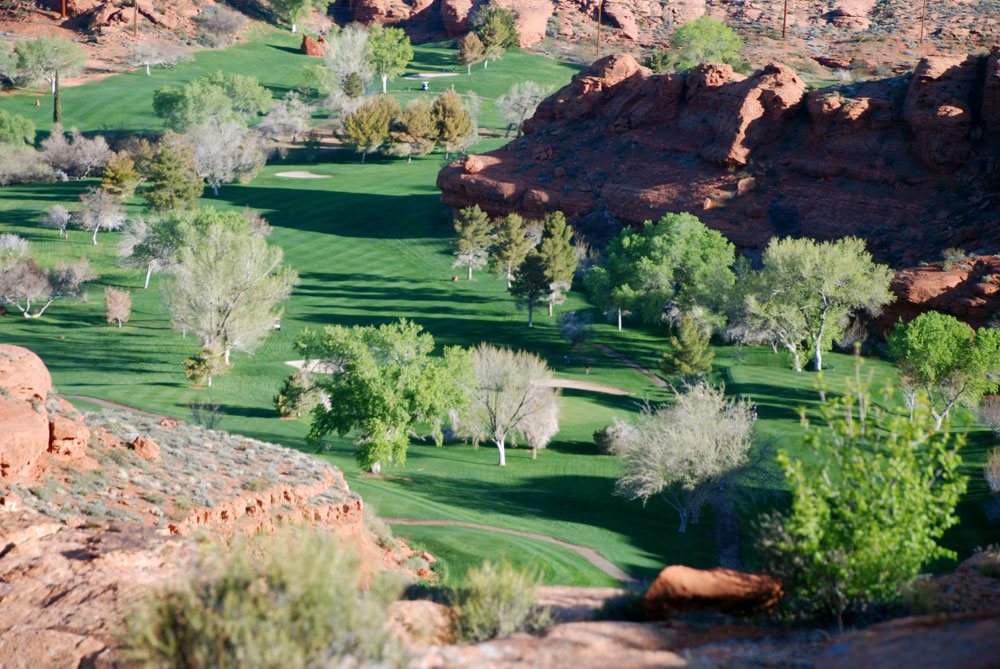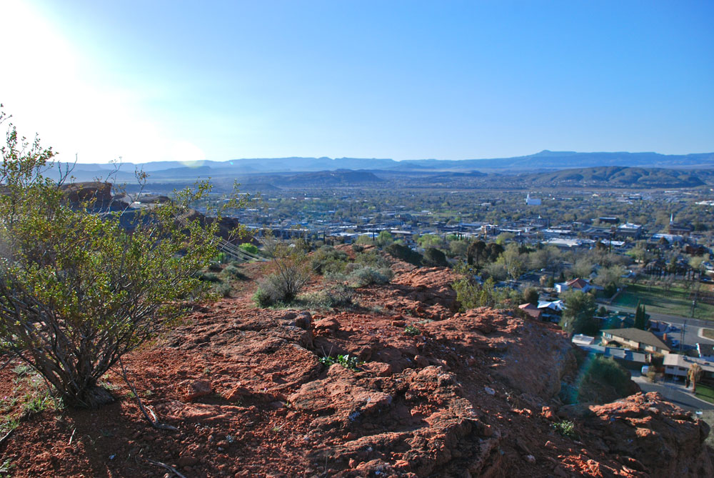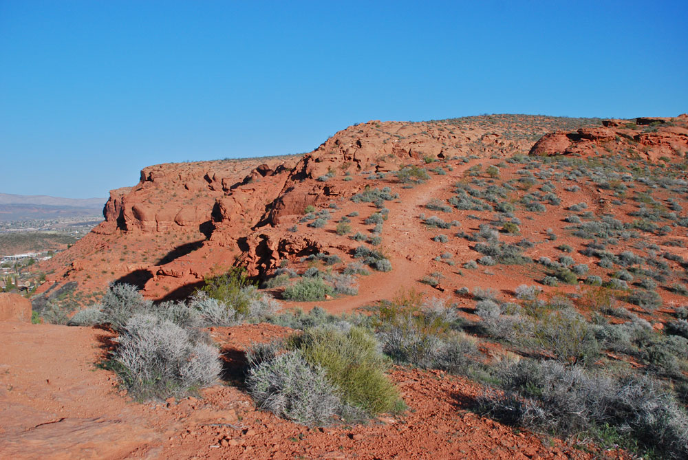 There were a couple of places where the trail became a little unclear, but after looking out for the cairns I was able to get back on course. The trail zipped around and moved me back closer to the edge of the cliff again. It was fun to be back to see where I was in relation to the city below me. I was surprised at how quickly I was moving along. There was plenty to look at and admire in the way of rock formations and plants, so it is no wonder the trail was passing so quickly by. As I approached the west rim of the hill I was presented with a delightfully clear view of Red Mountain and Santa Clara and Ivins. I could also see the contrasting red and white Navajo Sandstone of Snow Canyon and the monolithic blue mountain Pinevalley. As I continued around the loop I was looking over onto Red Hills Golf Course. So many contrasts, so many colors! Who knew there was so much waiting for me on this short little trail?